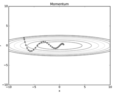 모멘텀은 “운동량”을 뜻하는 단어로 SGD에 한가지 특성을 가미한 것이다.