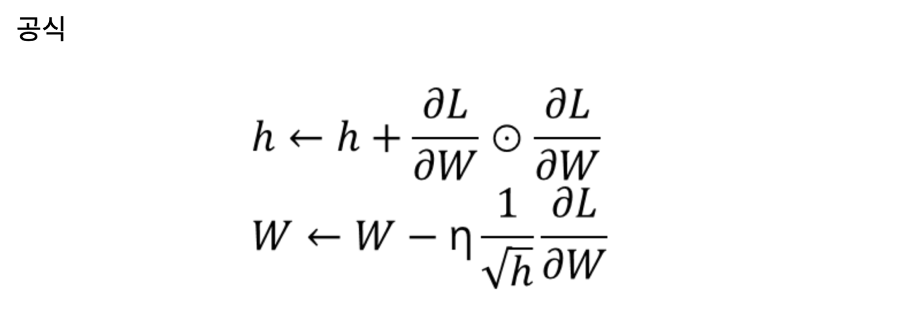 학습을 진행할수록 갱신 강도가 약해져, 어느 순간 갱신량이 0이 되어 전혀 학습이 이루어지지 않는 상황이 오며, 이를 개선한 RMSProp라는 방식이 제안되었다.
