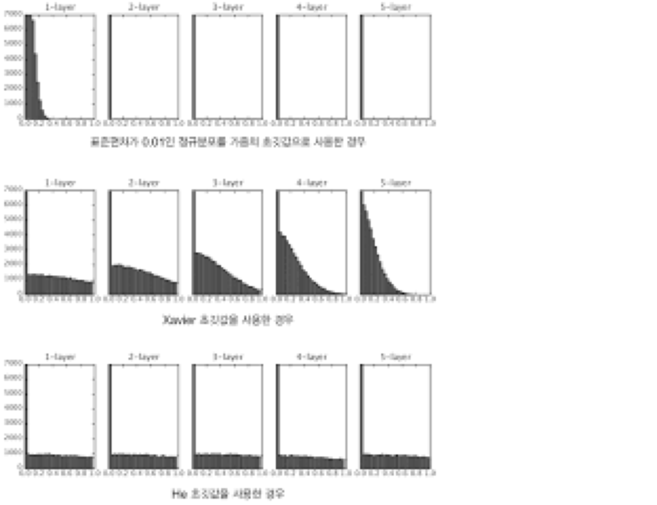 # 표준편차가 0.01인 정규분포 가중치 / Xavier 초기가중치값 / He 초기 가중치 사용하여