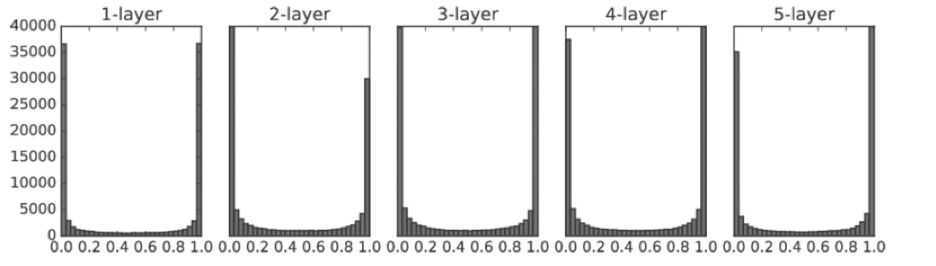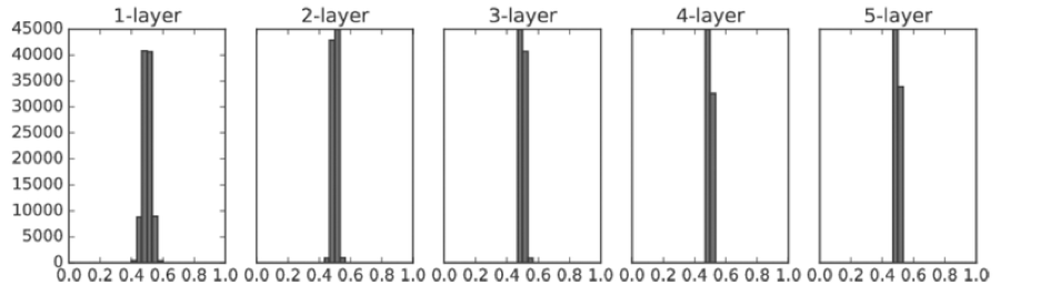 각 층의 활성화 값들이 매우 작은 값, 즉 0에 치우쳐있다. 이는 역전파 시, 정보를 충분히 전달할 수 없다.