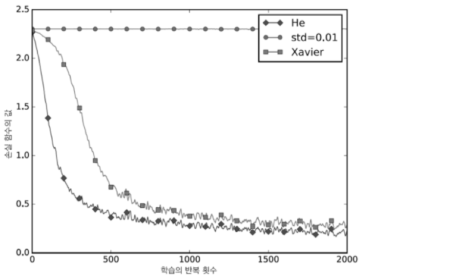 ReLU와 같은 비선형 활성함수를 사용할 때에는 ReLU에 특화된 초기값 이용해야한다!