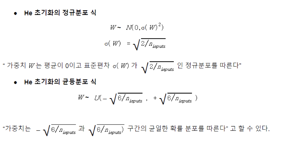 # 앞 Layer의 노드 수가 n일 때, 표준편차가 sqrt( 2 / n )인 정규분포 사용