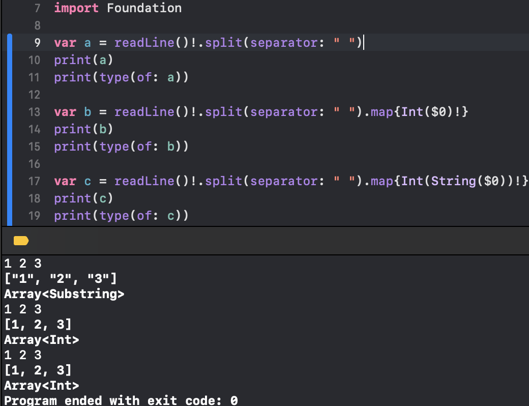 주의할 점은 split()했을 때 배열안에 담긴 값들의 type이 Substring이 된다는 것이다.