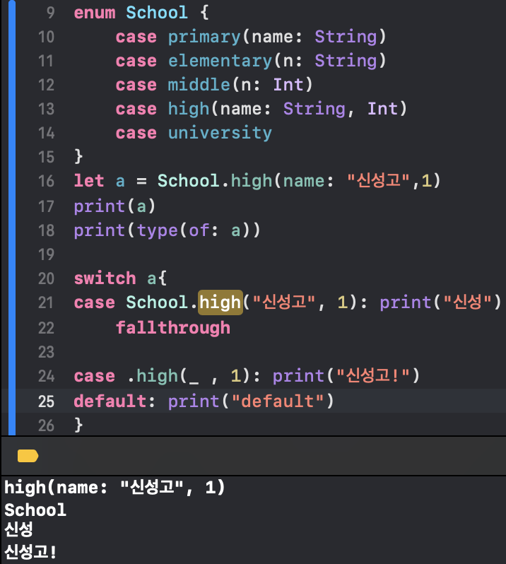 - 마치 열거형 항목이 Class혹은 구조체이며, 그 안의 멤버변수 혹은 프로퍼티가 생기는 것과 같다.