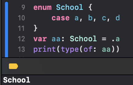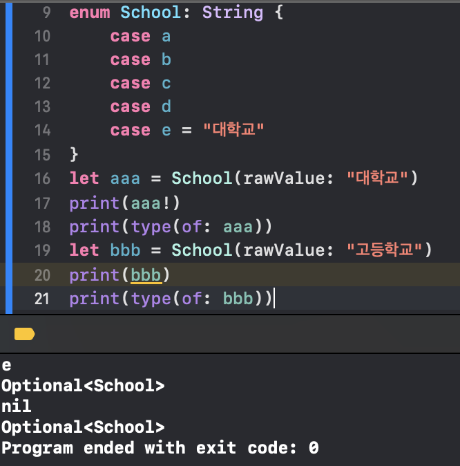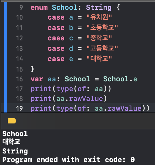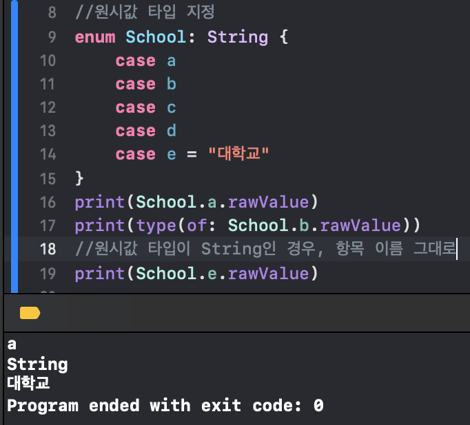 - 열거형 이름 옆에 "원시값" 타입 지정