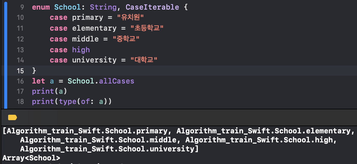 - CaseIterable 프로토콜을 채택하면 allCases프로퍼티로 모든항목이 포함된 배열을 얻을 수 있다.