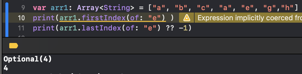 3. arr.index(of: 원소) -> 찾고자하는 "원소"의 맨 앞 index를 Optional타입으로 리턴 ==> Deprecated!!