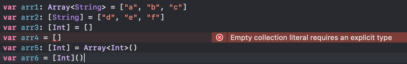 - 축약형이 없다!!! ( Array[Int]를 [Int]로 표시하는 것과 같은 축약형..)