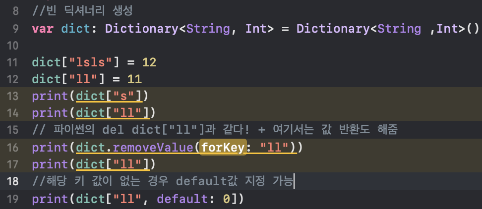 - 다른 점은 del dict["key"]를 dict.removeValue(forKey: "key")로 하면서 값을 반환해준다.