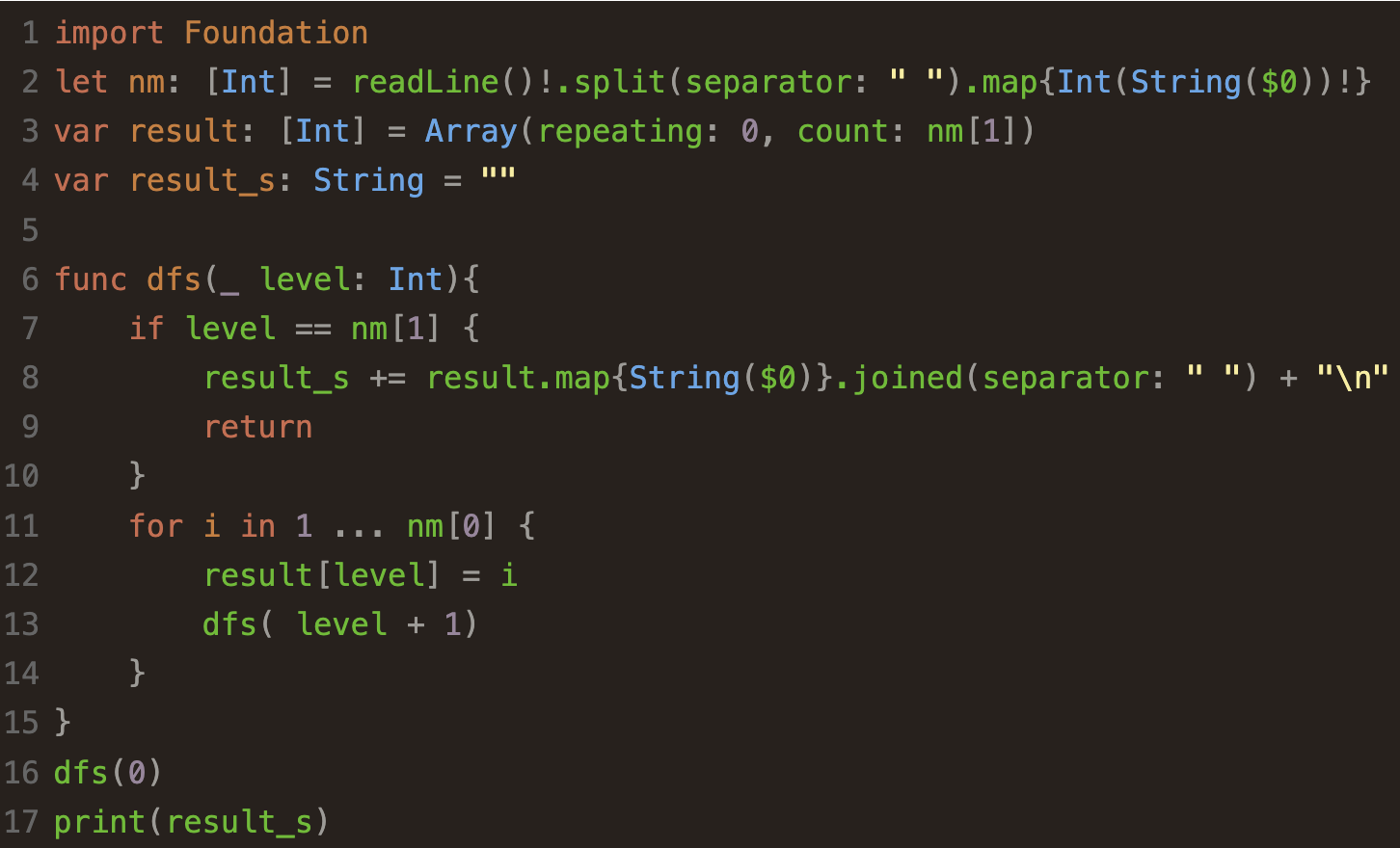 중복 순열로, 사실상 n개의 자연수를 m개의 자리에 한 번씩 다~ 넣어서 총 n x m개의 중복순열을 다 출력해주어야하는 문제이다.