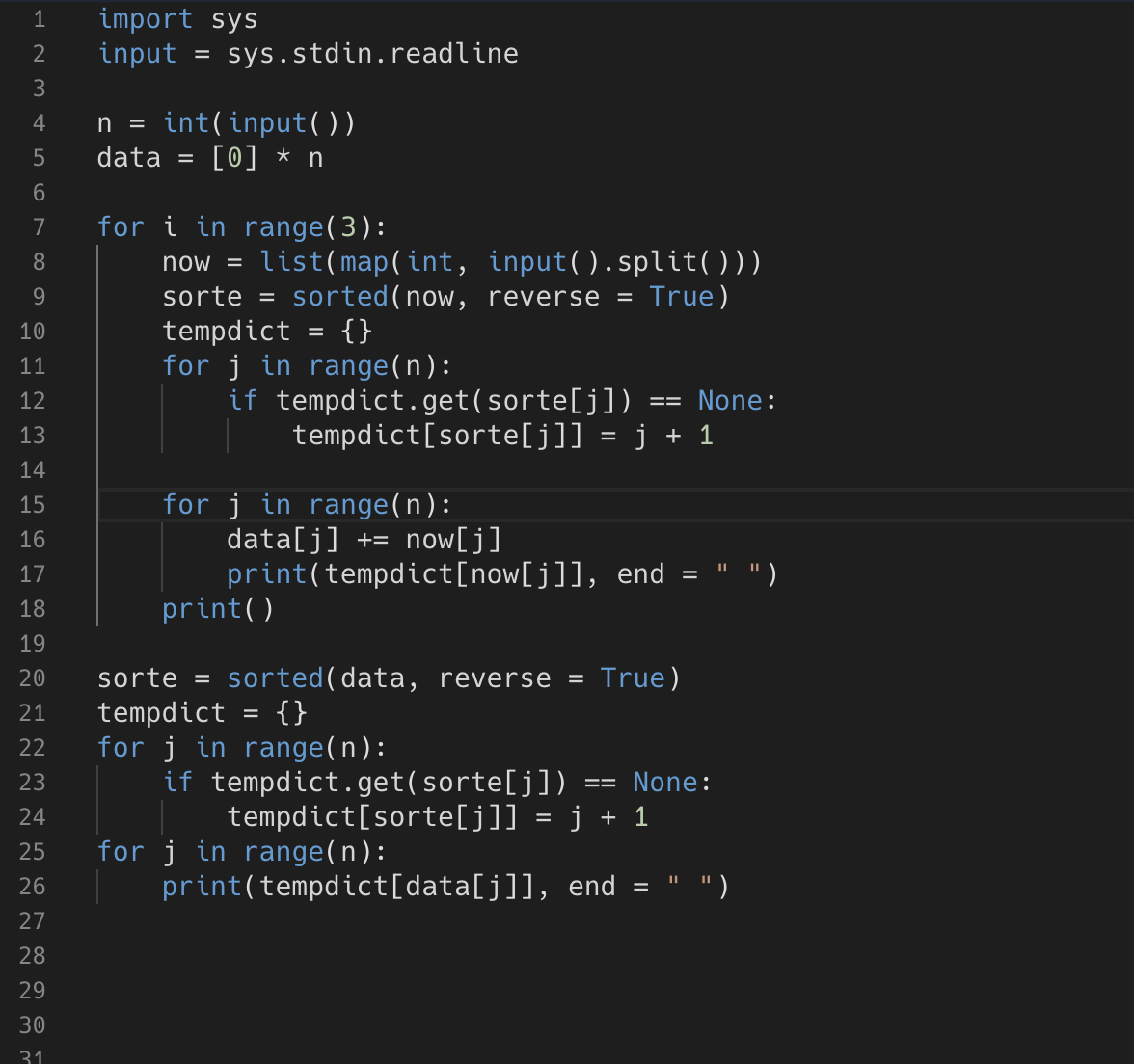 각 줄마다 dictionary를 활용해 등수를 바로바로 뱉어줄 수 있는 Hash를 만들어 활용하는 것이 포인트인 문제!