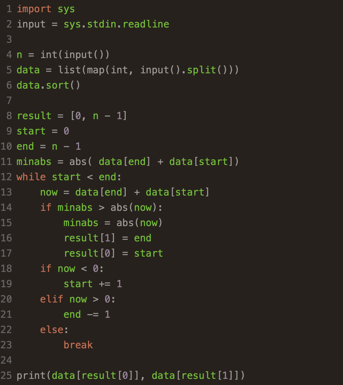 양 끝에서 시작하여, 안으로 좁혀 들어오다가, start가 end를 넘어서면 끝나는 기본적인 투포인터 문제였다.
