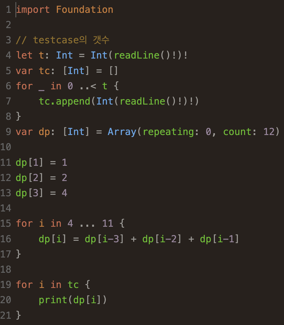 따라서 dp[3]의 경우의 수 * 1만큼 dp[4]에 더해준다.