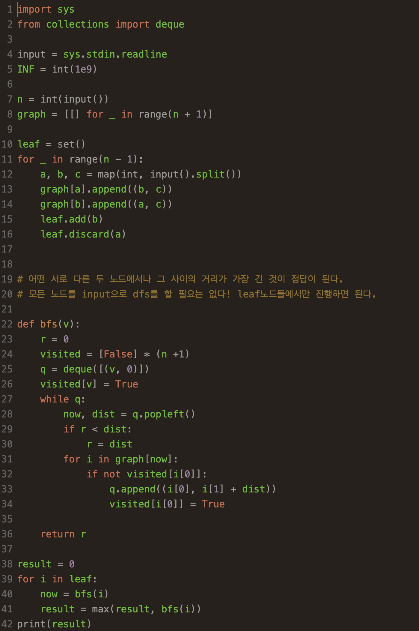 문제를 읽고나면, 모든 노드 간 거리를 구해, 그 중 가장 긴 거리를 답으로 내면 될 것이라 생각하여