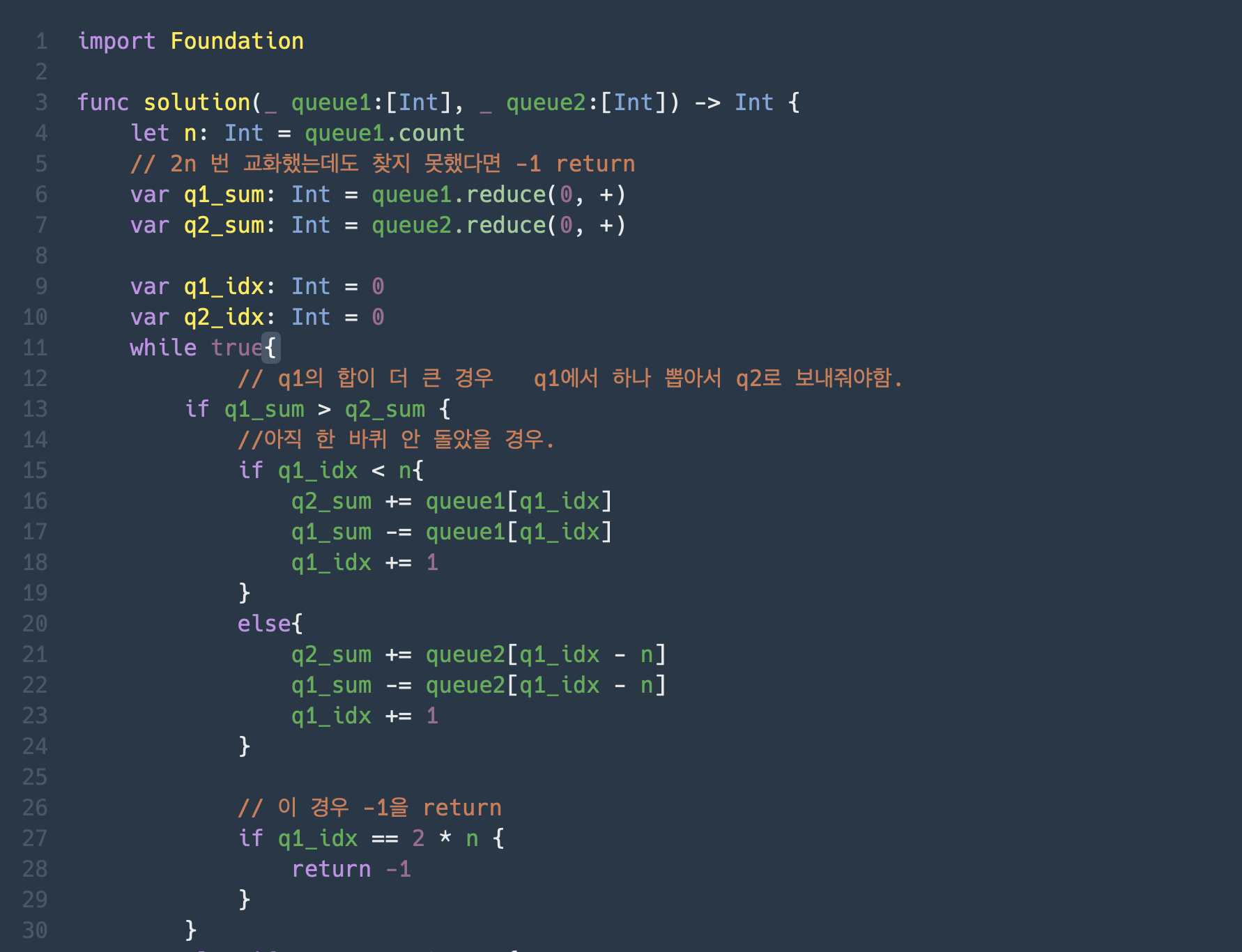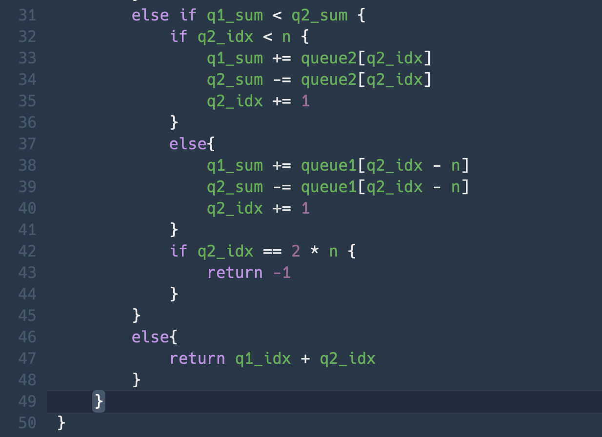 queue간 숫자를 직접 pop하고 push하는 과정은 일체 진행하지 않고, 포인터와 합계 수정만으로 풀이하였다.
