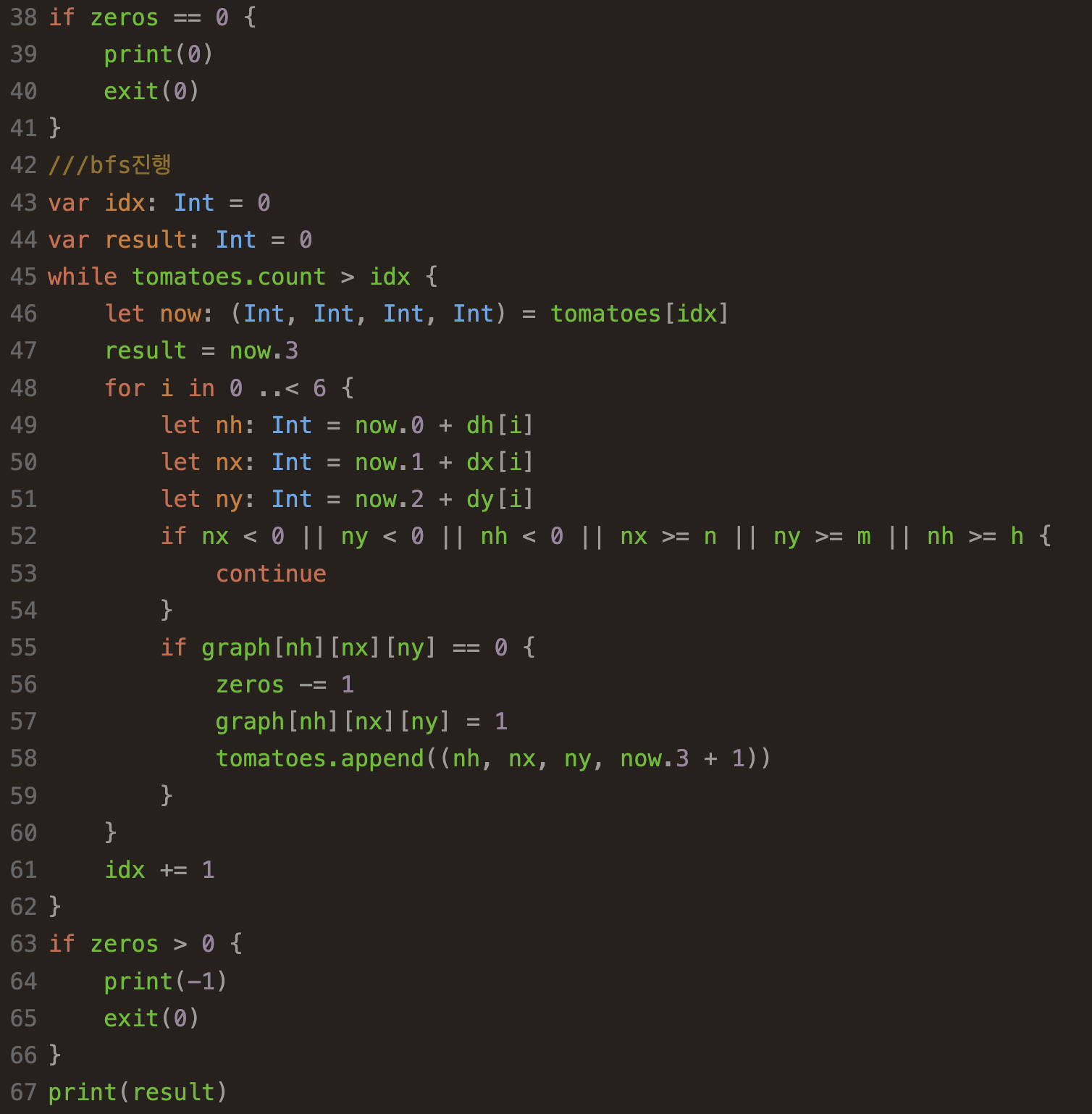 초기 익지않은 토마토의 갯수를 세놓은 후, bfs가 진행되며 0이 1로 변하는 ( 토마토가 익게 되는) 경우마다 0의 갯수를 1씩 줄여나간다.
