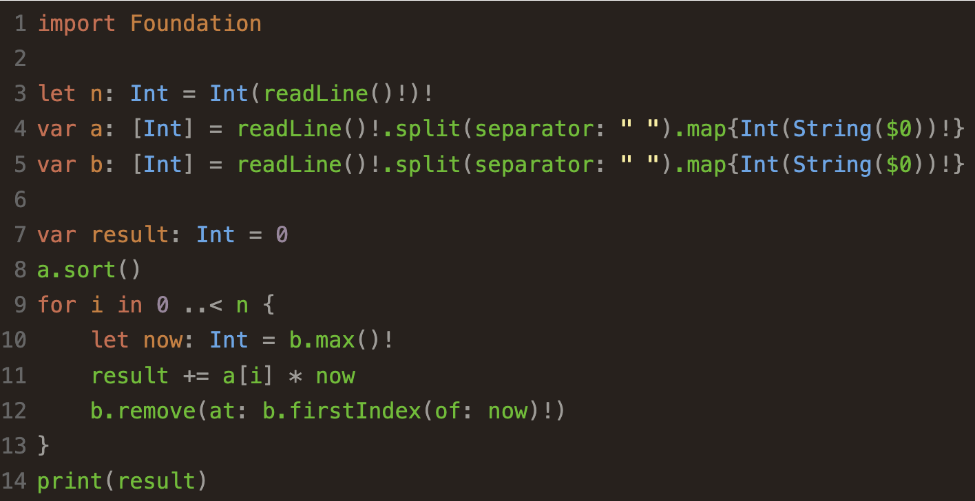 같은 길이의 두 배열이 주어지면, 하나의 배열만 정렬하여 아래 수식의 값을 가장 작게 만들어야하는 문제이다.