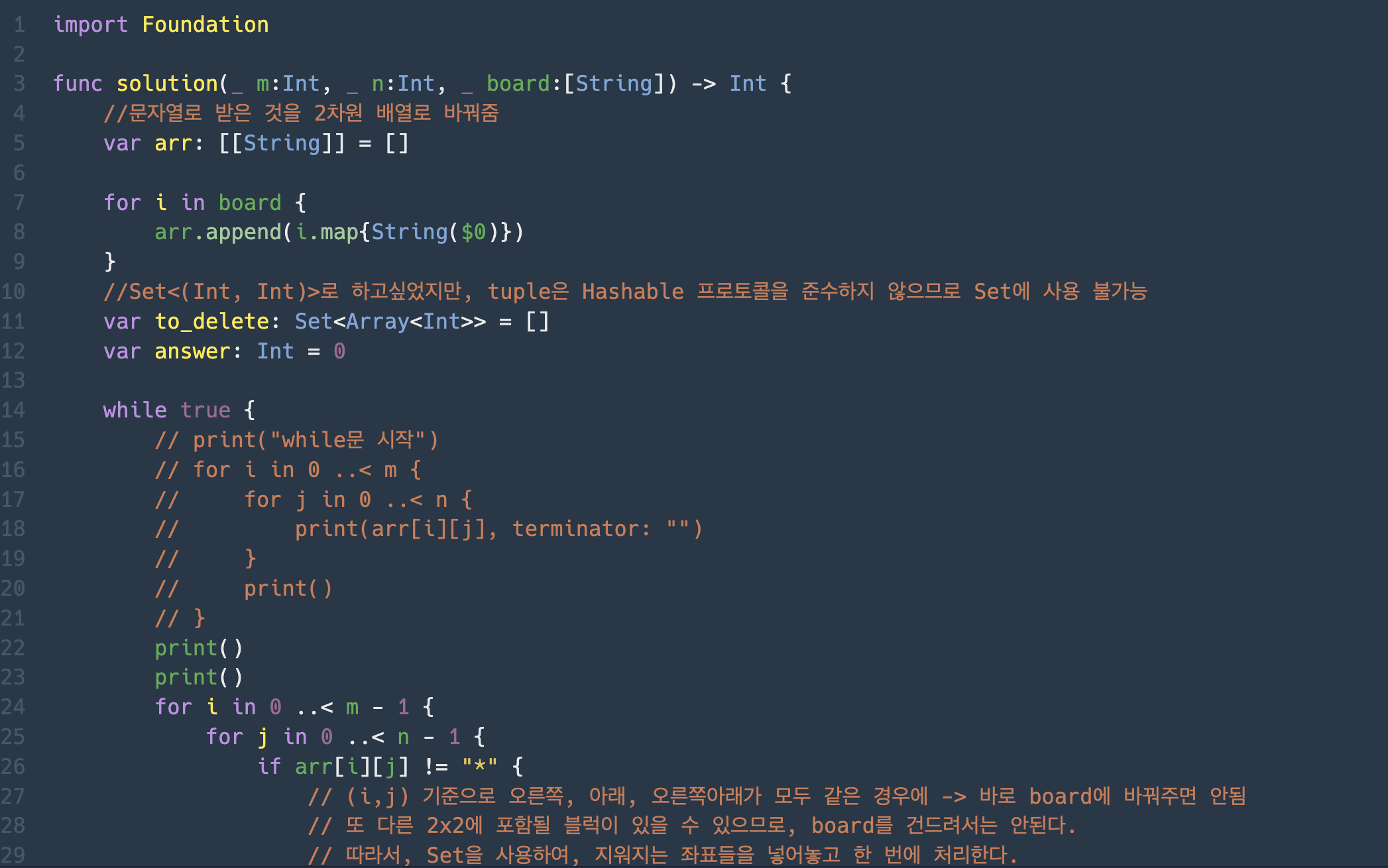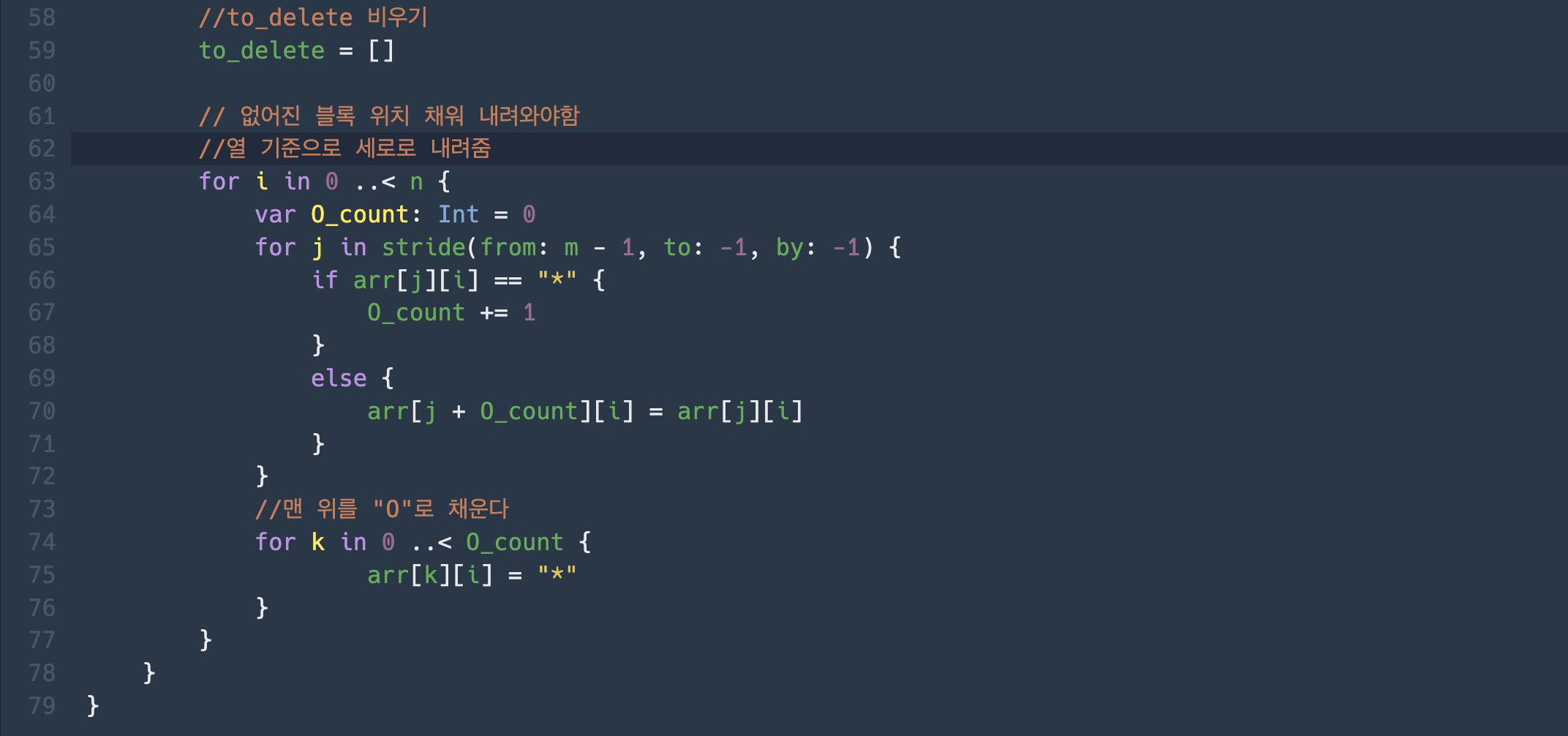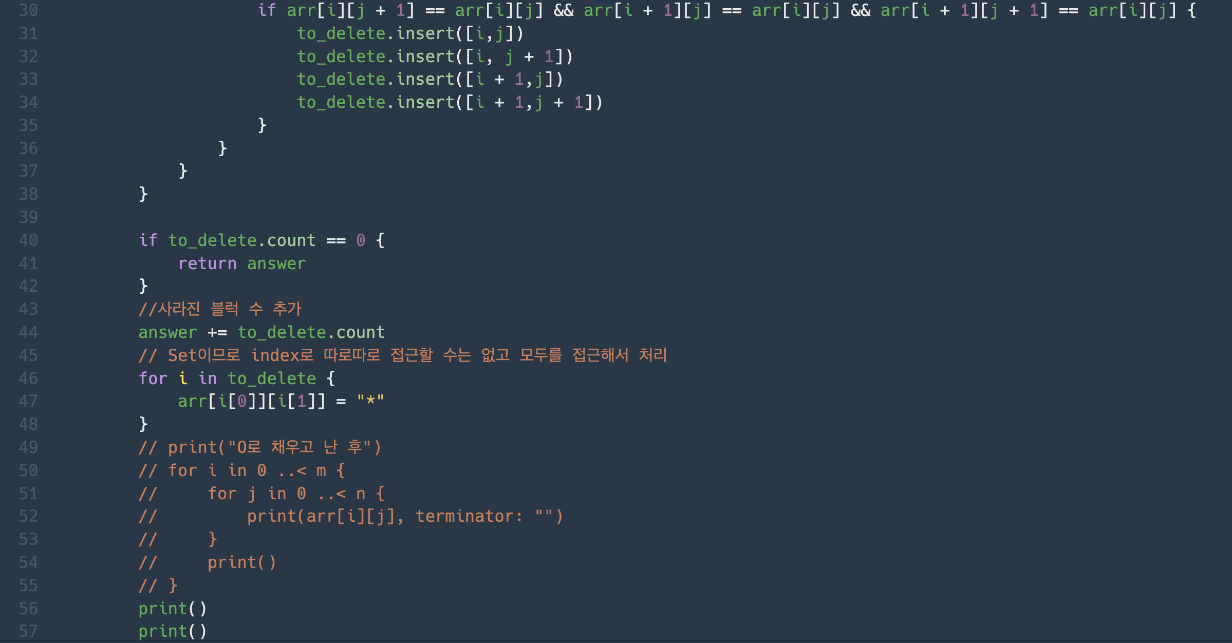 -> 지울 블록의 좌표는 겹쳐서 지우지 않기 위해 Set<[Int]>자료형을 사용