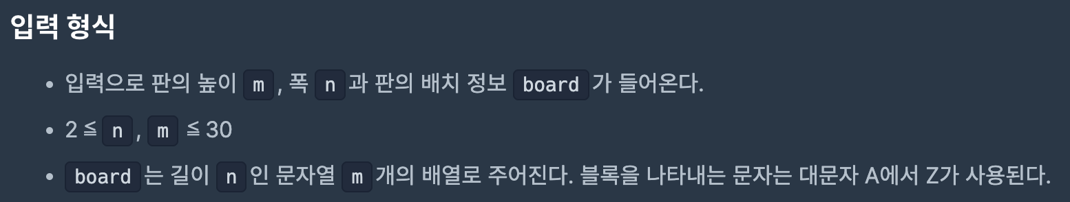 -> 그때 그때 파괴하지 않는 이유는, 여러 2x2 영역에 겹쳐서 포함될 블록이 있을 수 있으므로, 미리 지우면 안됨