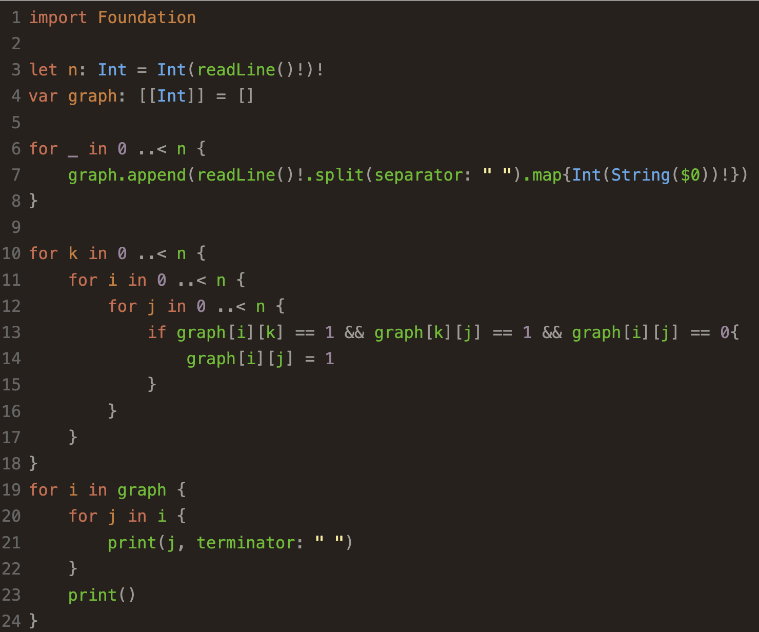 이는 자기자신에서 다른 node들을 통해 자기 자신으로 돌아올 수 있는 경로가 존재하는 경우에 1로 나타냄을 눈치채야한다!!
