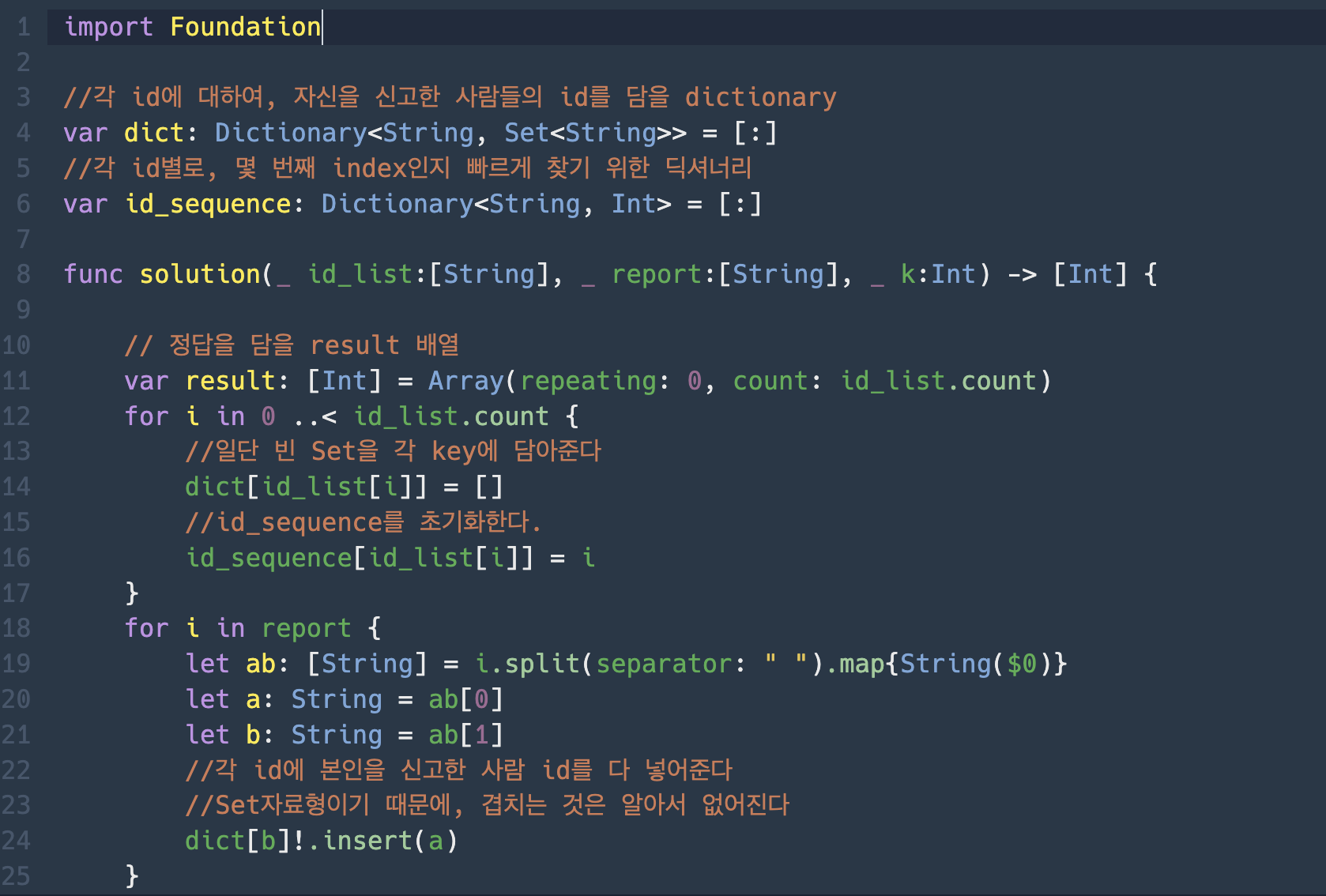 - dict라는 딕셔너리에는, key에 모든 Id를 담아, 자신을 신고한 사람들의 id를 모두 담는다 ( 중복 제거를위해 Set자료형으로 )