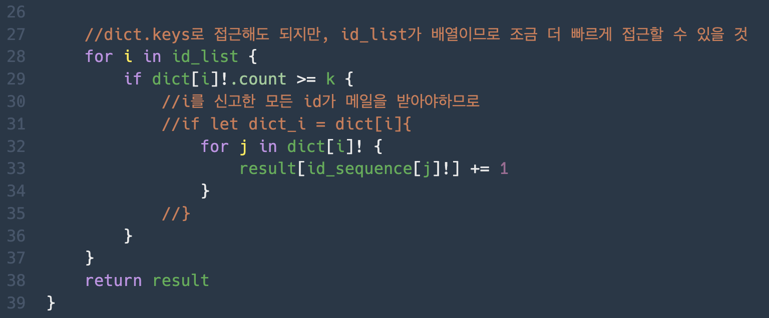 이후, dict의 모든 key에 대하여, value인 Set의 크기가 K 이상인 경우에, 그 Set에 담겨있는 Id들에 대하여 메일을 받도록 ( result배열에서 1씩 추가!) 처리해주면 끝
