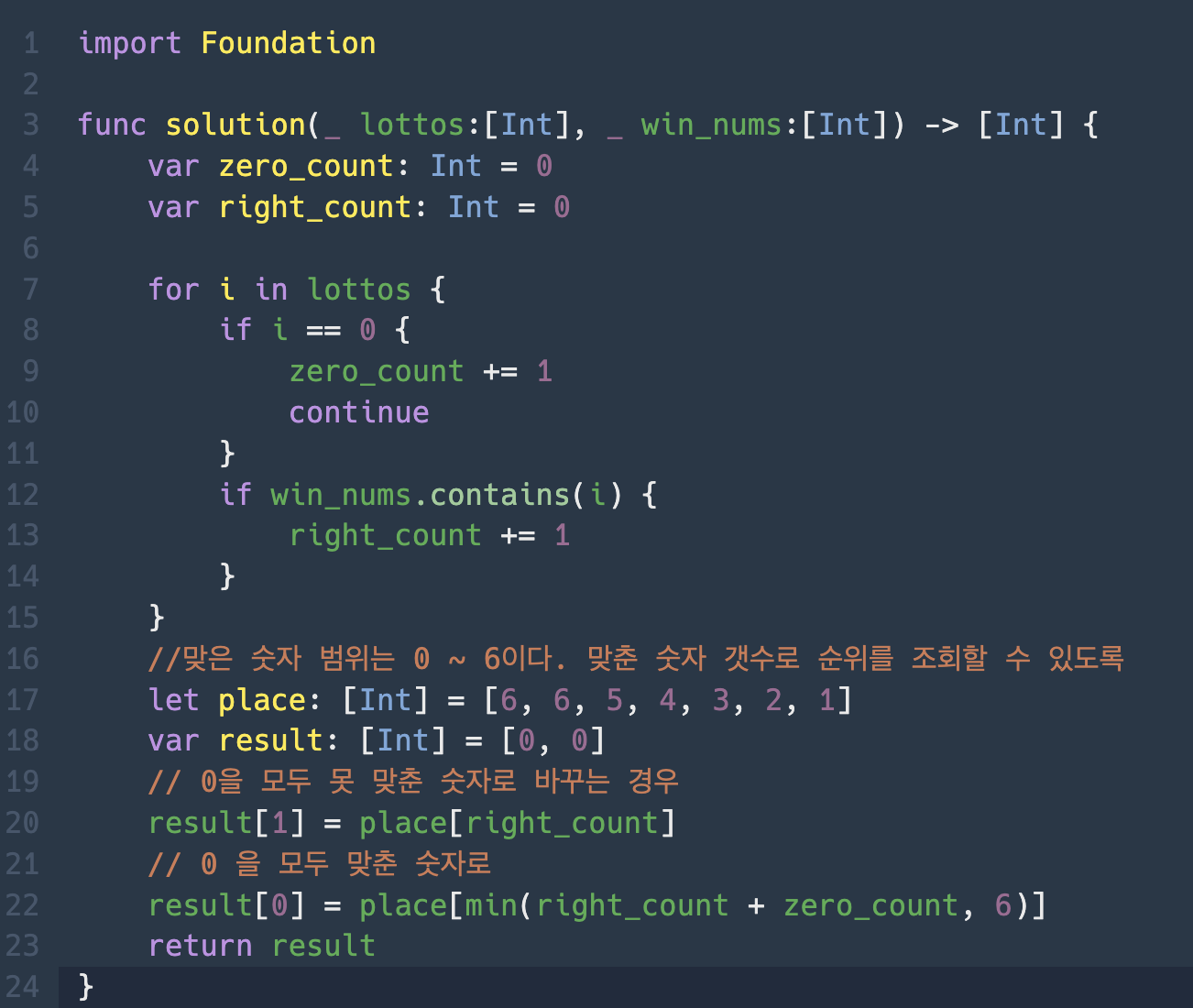 0의 갯수를 따로 count해주어, 0이 맞춘 숫자로 간주될 때와, 못 맞춘 숫자로 간주될 때를 나누어 구해주면 된다.