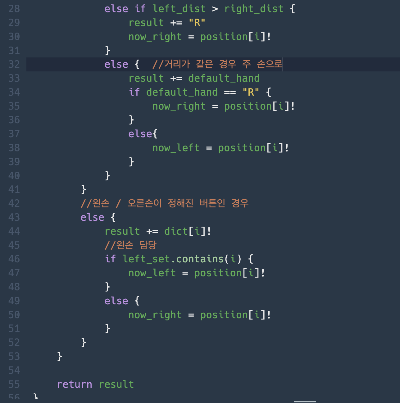 (1)- 1,4,7 / 3,6,9와 같이 눌러야 할 손이 정해진 버튼이라면 결과 문자열인 result에 "L"혹은 "R"을 이어붙이고, 다음 판단을 위해 마지막으로 위치한 왼손 혹은 오른손의 위치를 now_left/now_right에 갱신해준다.