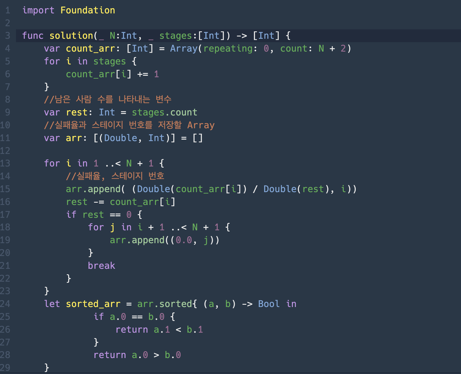 먼저, stages 배열을 돌며 각 숫자가 몇개인지 Count하여 count_arr 배열에 저장해놓는다