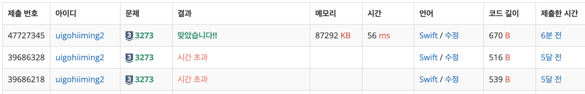 몇달 전 아래처럼 시간초과를 해결하지 못하고 포기했던 문제가 "실패"라고 떠있는 것을 보고 다시 풀어보았는데, 간단히 풀이할 수 있었다.