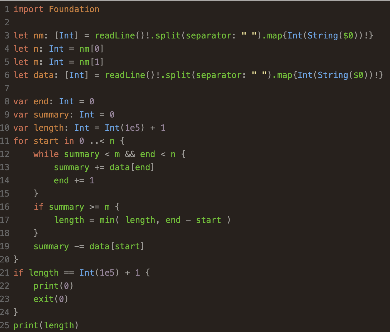 백준 1806: 부분합 (Swift)