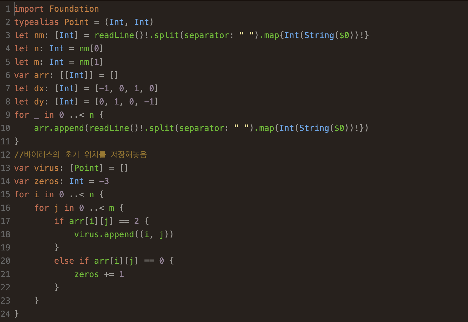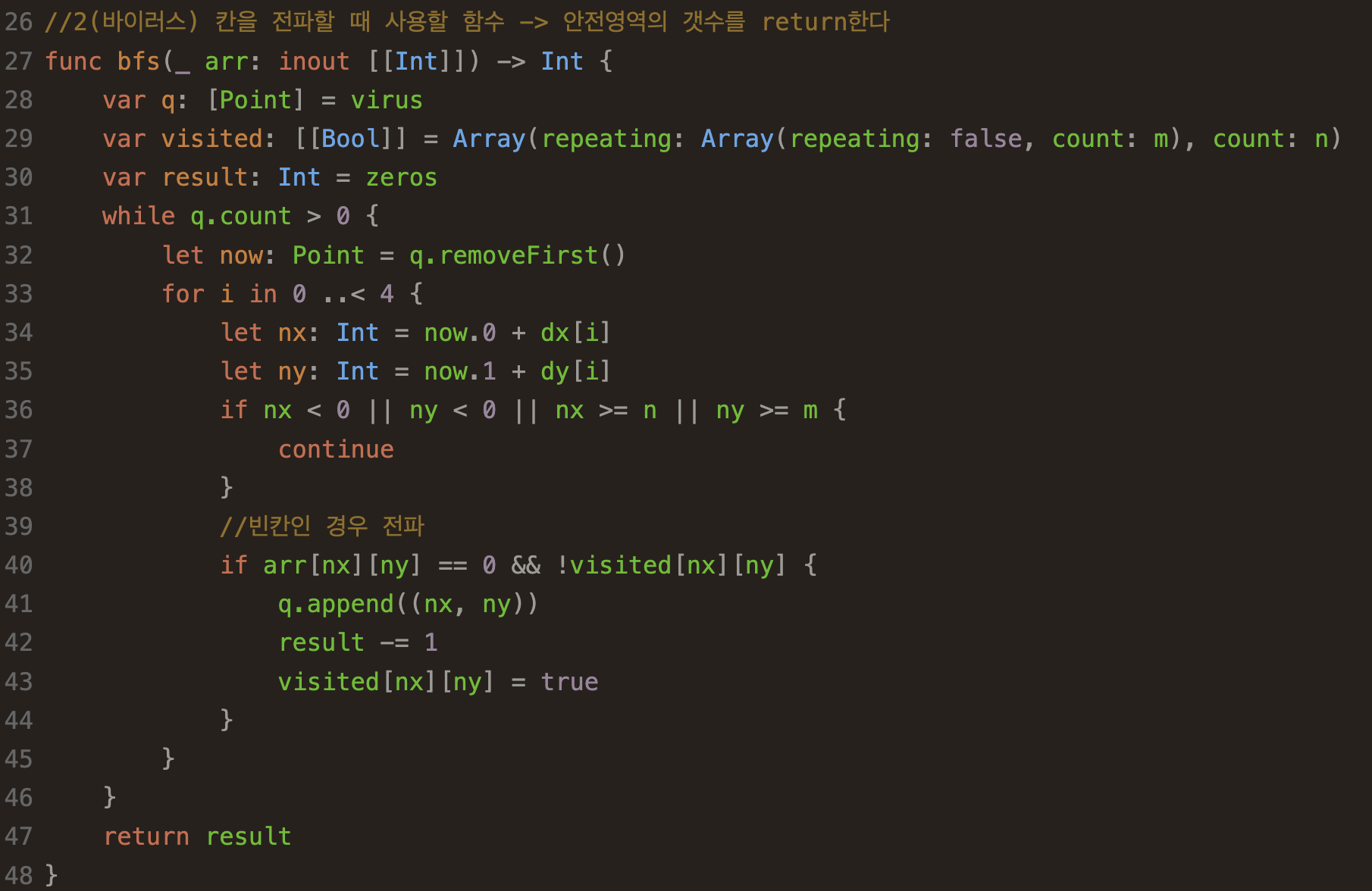 Point 4. 바이러스를 전파하며 arr의 0들을 2로 바꾸는 식으로 함수를 작성하였었다. 하지만 그렇게 하려면 n * m 크기만큼의 Int형 배열이 필요하기 때문에, visited라는 n * m크기의 Bool 배열을 사용하는 것이 메모리 면에서 효율적일 것이라고 생각했다.