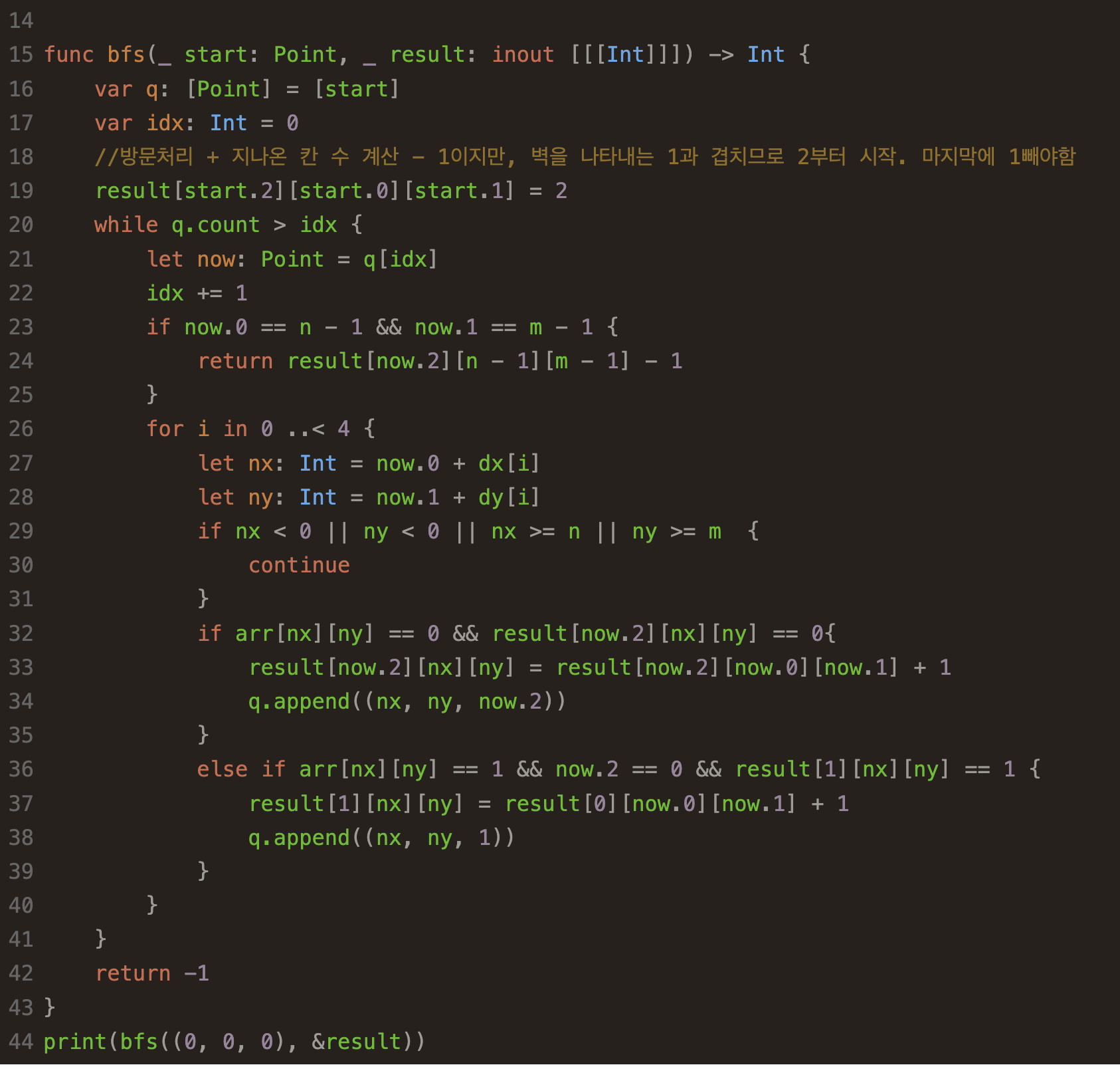 따라서 typealias Point를 queue에 넣고 빼며 마지막 Int가 0이면 벽을 뚫은 적 없는 것, 1이면 벽을 뚫은 적 있는 것