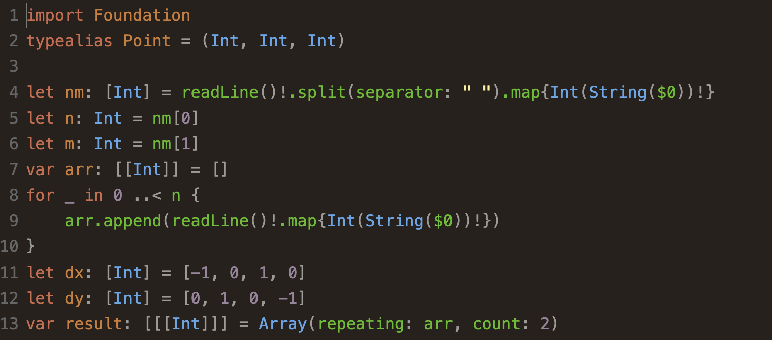 typealias Point를 3개의 Int를 가진 튜플 형태로 만들어 (x좌표, y좌표, 벽을 부순적 있는지 여부 0/1 ) 를 나타내도록 하였다.