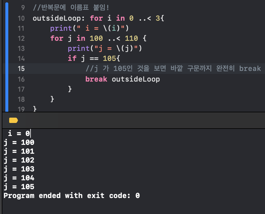 ( 이와 같은 기능이 없다면, is_105라는 Bool 틱을 변수로 두어 true로 체크해주고, 바깥 for문에서 매 번 is_105 == true인지 확인하고 break해주는 코드를 실행했어야했다.)
