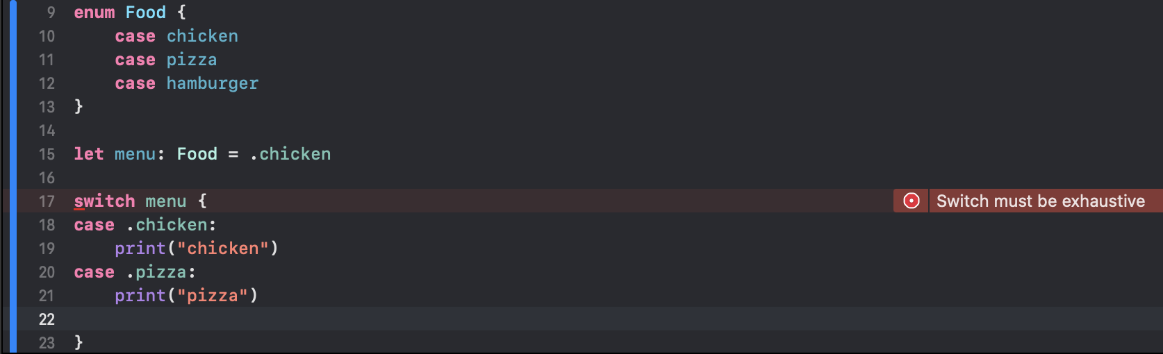 아래와 같이 한정된 범위의 모든 항목들을 처리할 case를 작성하지 않으면, exhaustive해야한다는 경고로 컴파일이 불가능하다.