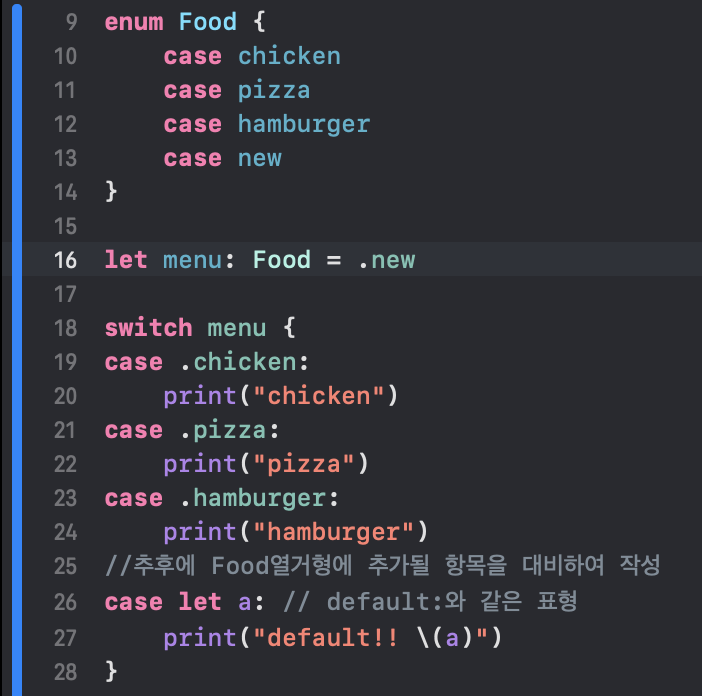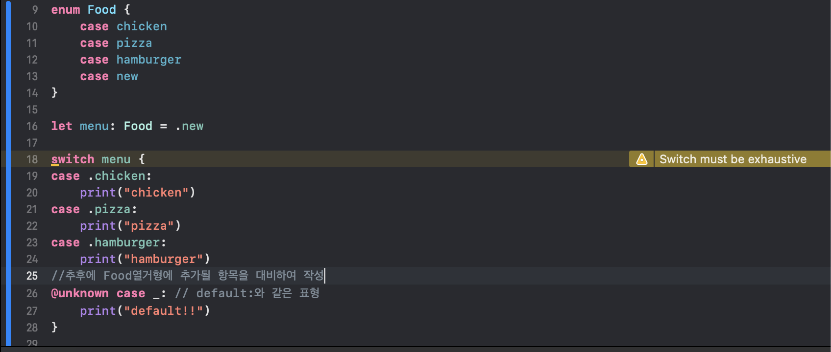 하지만 새롭게 추가될 항목에 대한 대비를 @unknown과 함께 작성해놓는다면, 새로운 값에 대한 개별 switch case를 작성하라는 경고를 받을 수 있어 실수를 보다 쉽게 찾을 수 있다.