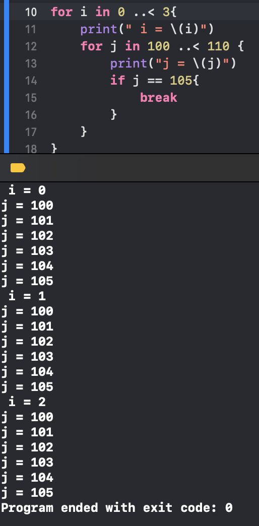 아래와 같이, j ==105가 되는 순간 바깥 Loop까지 한 번에 종료할 수 있다.