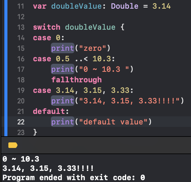 ( 해당 Case 실행 후, switch문을 벗어나지 않고 아랫쪽 case까지 탐색하고싶다면 fallthrough 키워드 사용!)