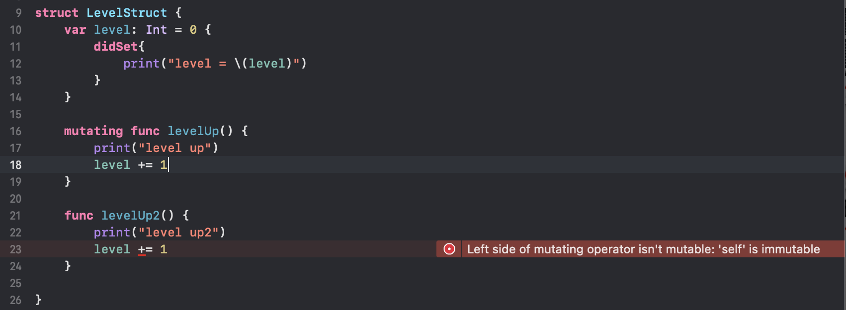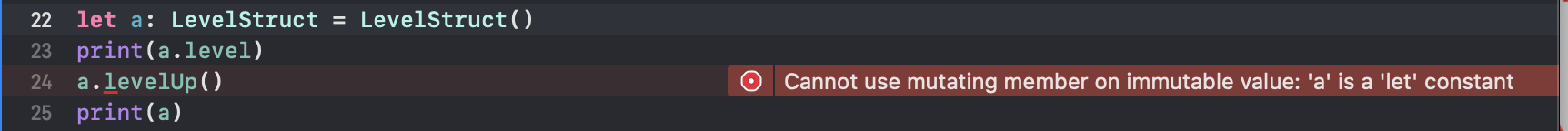또한, let 으로 구조체 인스턴스를 생성할 경우, 내부 프로퍼티 값을 변경할 수 없다.