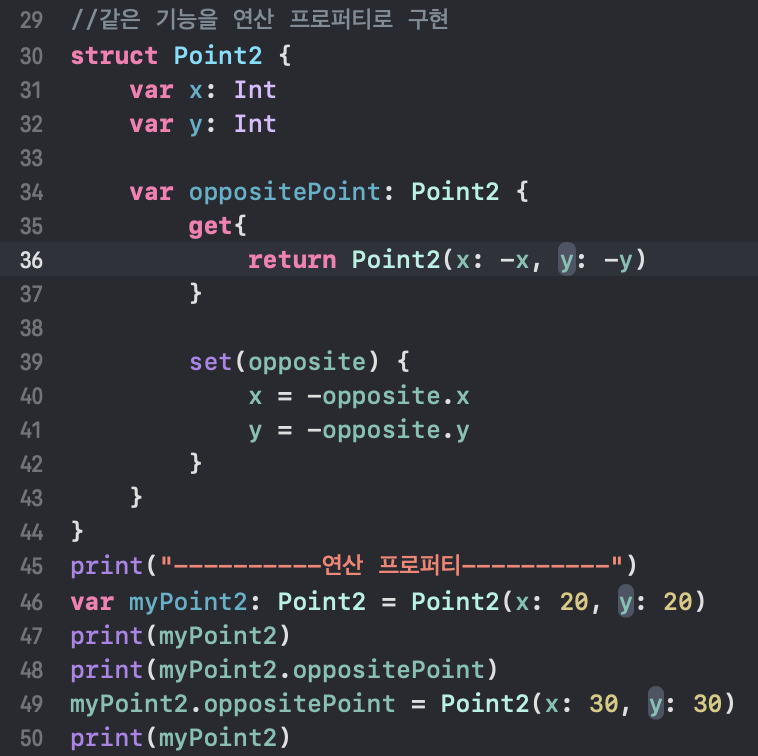 ==> why? 연산 프로퍼티는 감시자를 사용할 필요도 없고 할 수도 없는 이유는, 연산프로퍼티 내부에서 값의 변화에 대한 구현이 다 가능하기 때문.
