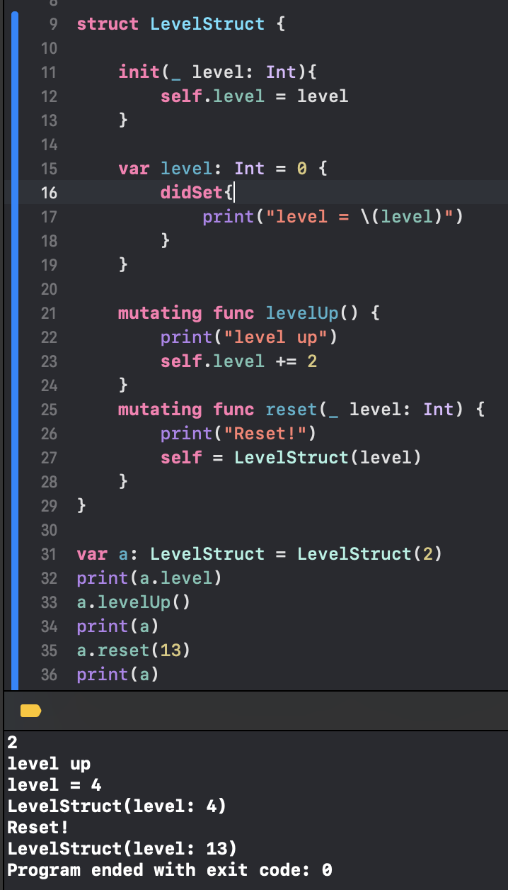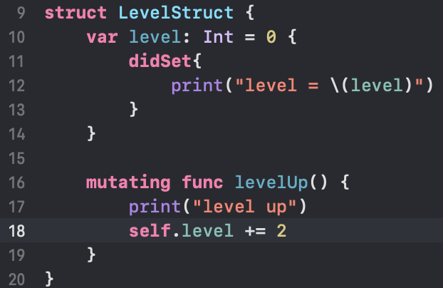 아래 그림18번 줄처럼 self로 프로퍼티 level 을 명확히 지칭할 수 있다.