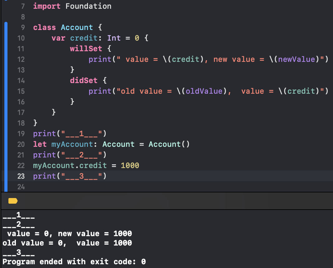 - didSet => 프로퍼티 값이 변경된 직후에 호출 ( 변경되기 전 값을 매개변수로 줌 oldValue)