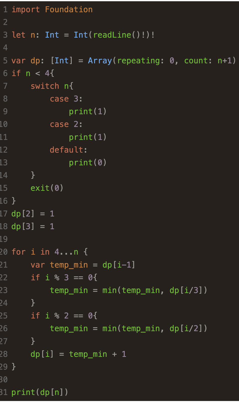 먼저 dp = Array(repeating: 0, count: n+1)로 0번 ~ n번 인덱스까지 모두 0으로 초기화해주었다.