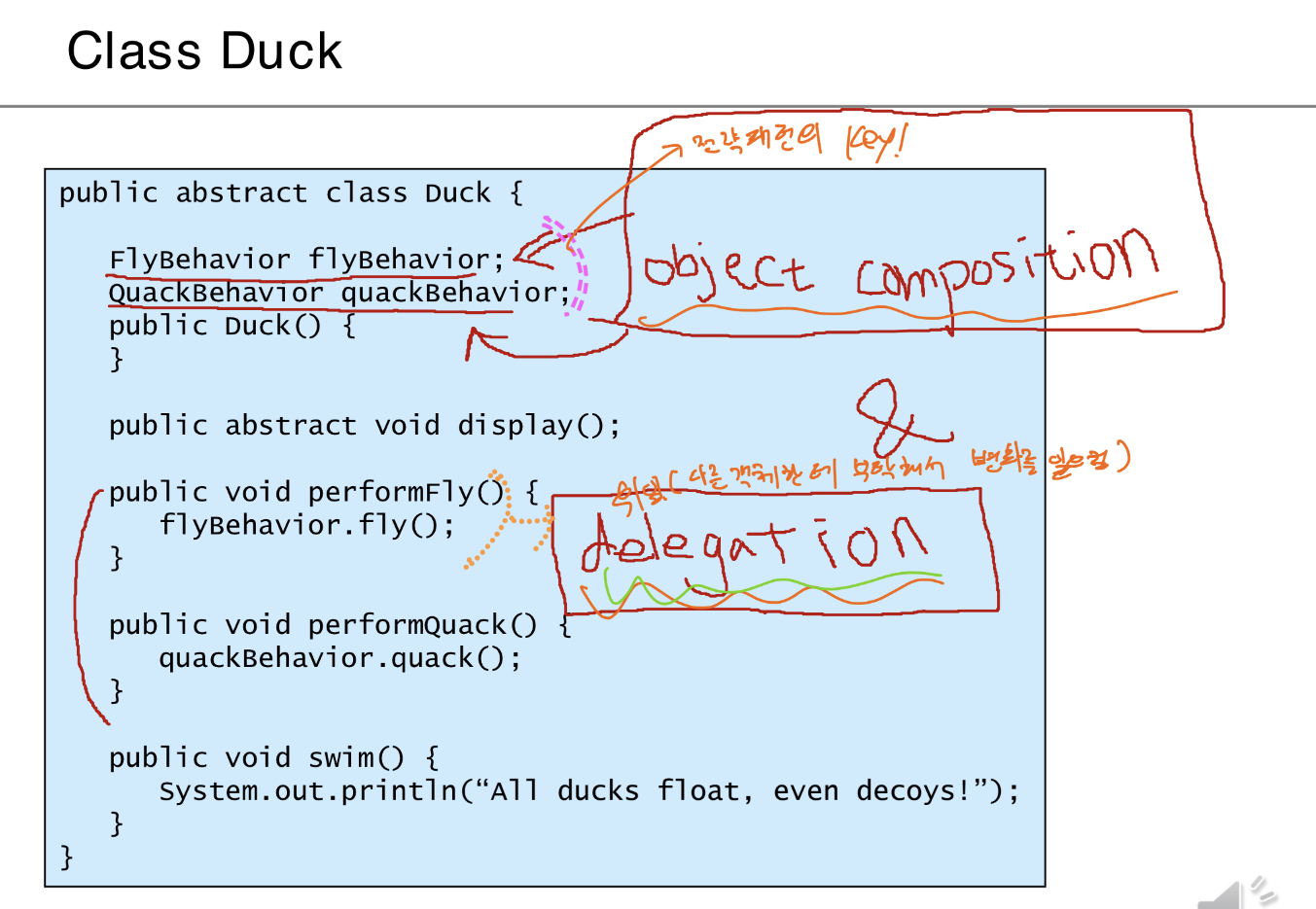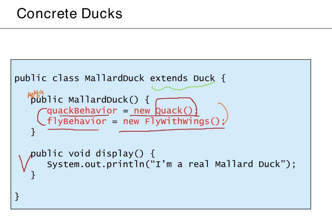 아래처럼 Duck 의 서브클래스에서는, 각 서브클래스에 맞는 행동 클래스 Object 를 생성하여 superclass에 선언해놓은 인터페이스 타입이 가리키도록 한다.