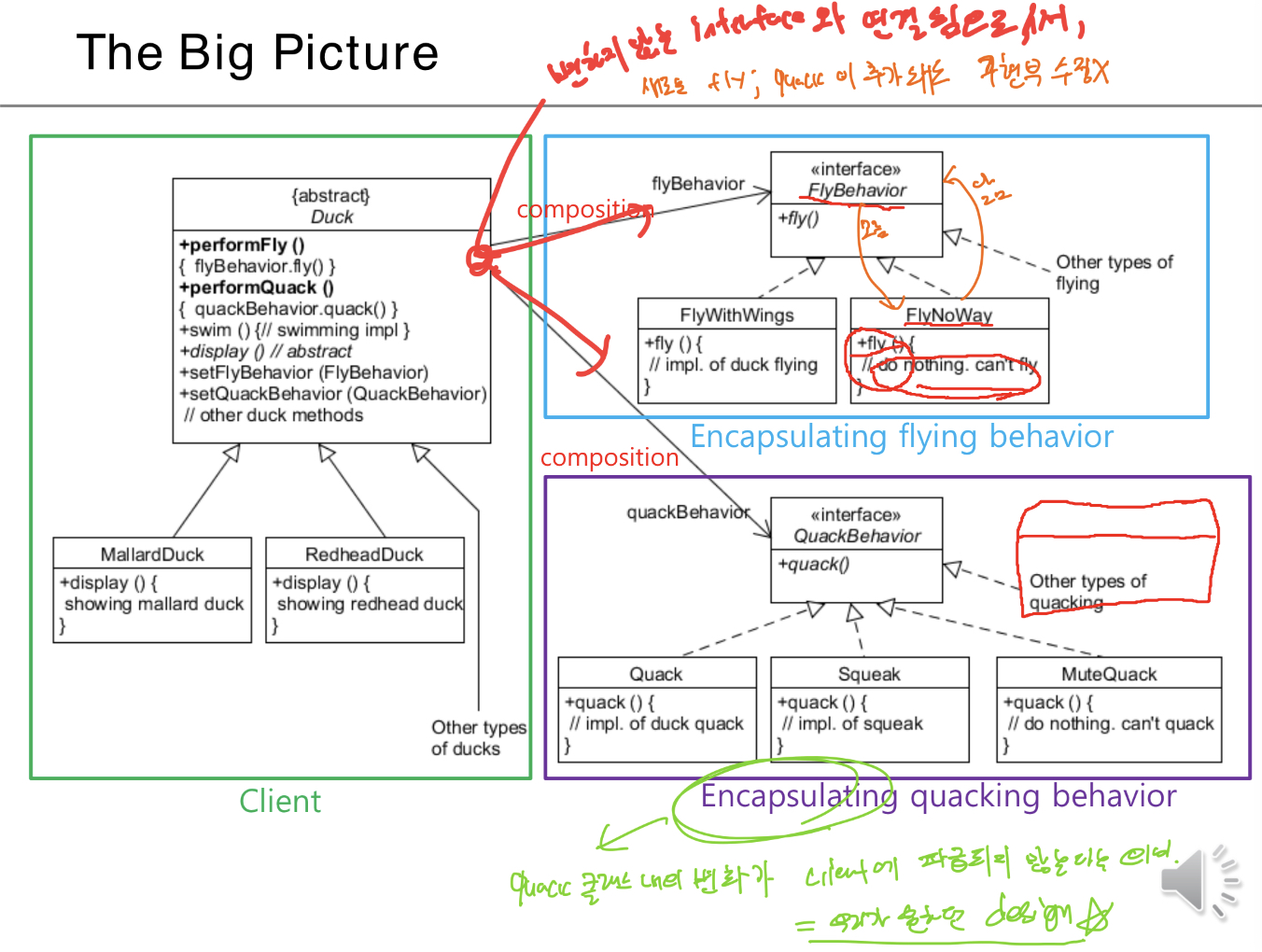 아래와 같이, subclass마다 달라지는 부분인 FlyBehavior와 QuackBehavior를 Interface로 구성하고,