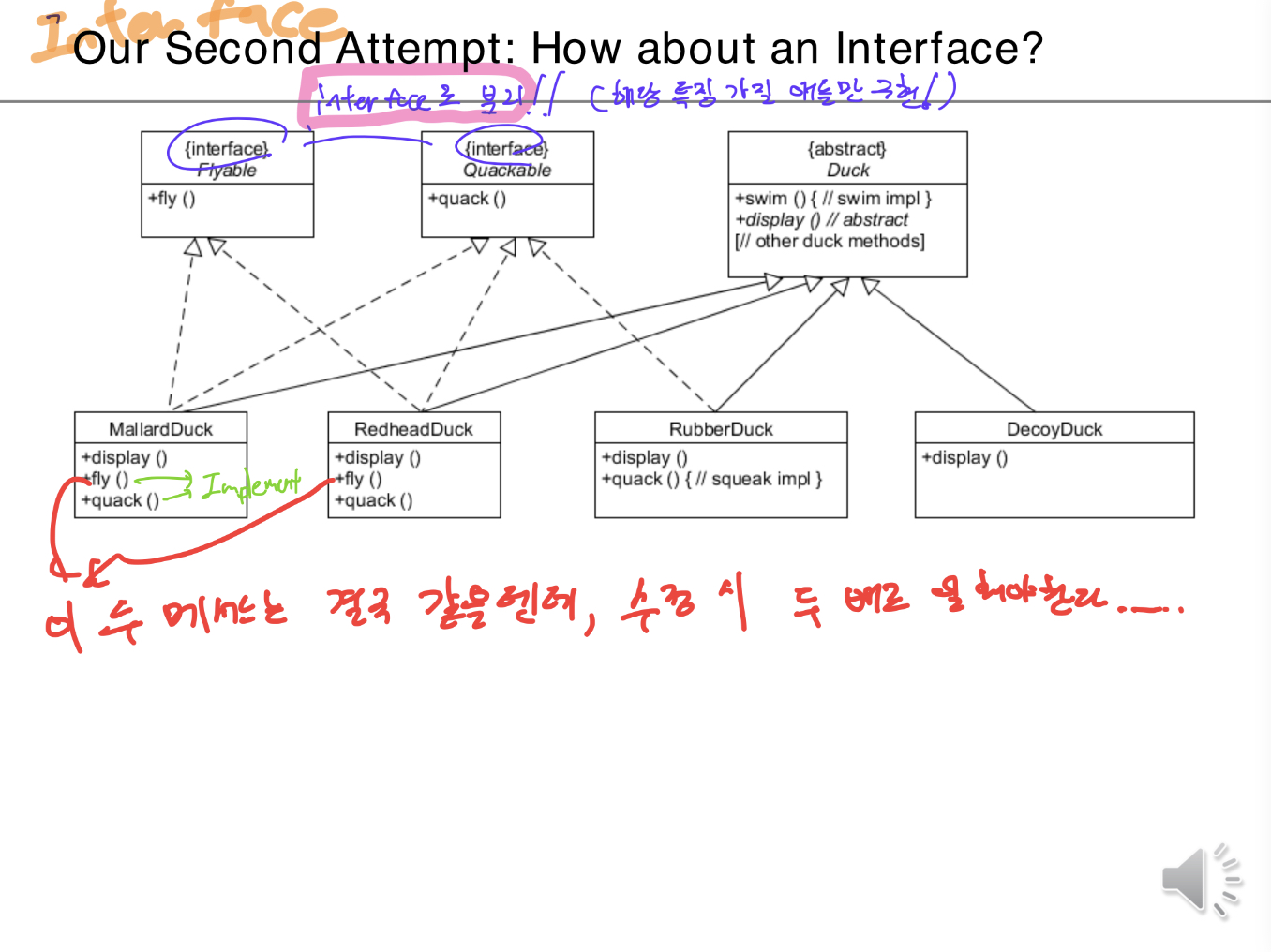 => 해당 특성 (fly, quack)을 갖지 않을 subclass에 구현하지 않을 수 있다는 점은 개선됨