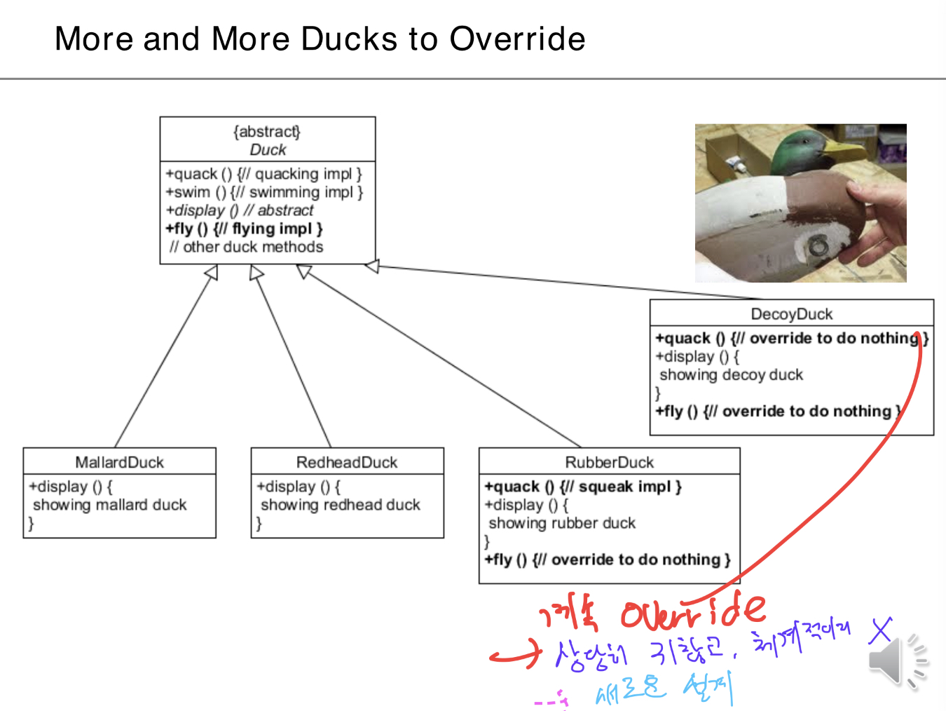 - 3. 모든 subclass들이 fly()에 관하여 어떤 행동들을 하는지 다 알기 힘들다. ( 관리하기 어려움 )